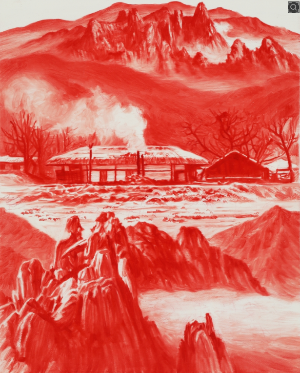 이 작가는 군 복무 시절 군사분계선에서 야간투시경으로 바라본 비무장지대(DMZ) 풍경을 그렸다. 붉은 색감 바탕에 전통적 동양화의 시점과 서양의 원근법을 결합해 재구성했다. 비무장지대의 풍경은 아름다운 자연이지만 현실은 적의 침입에 대비해 늘 긴장하고 경계해야 하는 이중성을 지닌 곳이다.