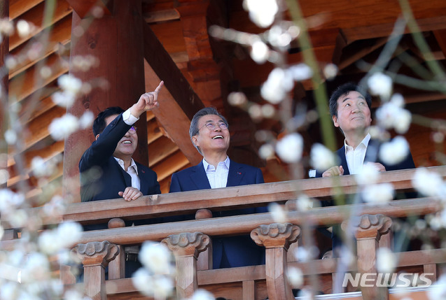 【인천=뉴시스】전신 기자 = 문재인 대통령이 2일 인천 연수구 경원루에서 열린 확대 국가관광전략회의에 앞서 이낙연 국무총리, 박남춘 인천시장과 함께 센트럴파크 전망을 둘러보고 있다. 2019.04.02. photo1006@newsis.com