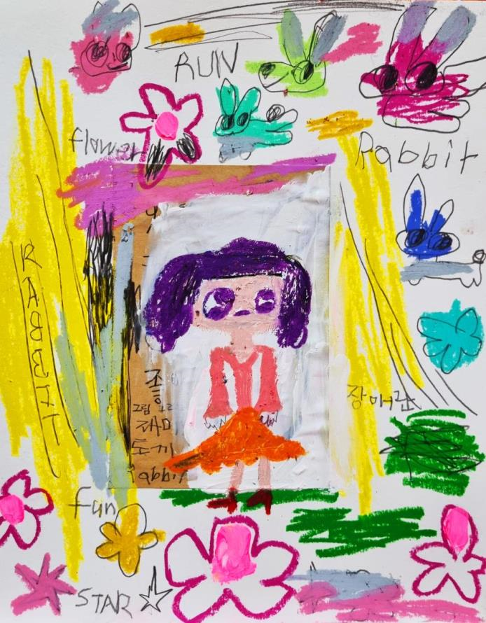 장애란, 유년의 뜰, 34x40cm, collage, oilpastel, pencil, acrylic on paper, 2022